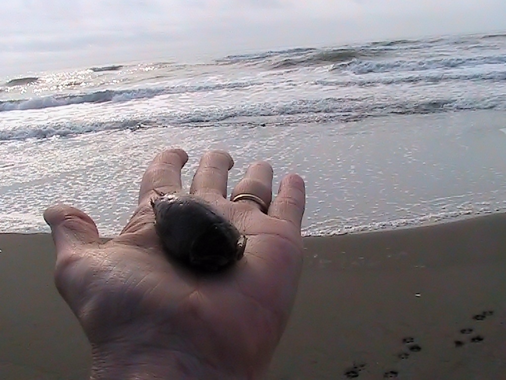 I like this shot of my hand and the sandcrab facing his final voyage, back to the sea....