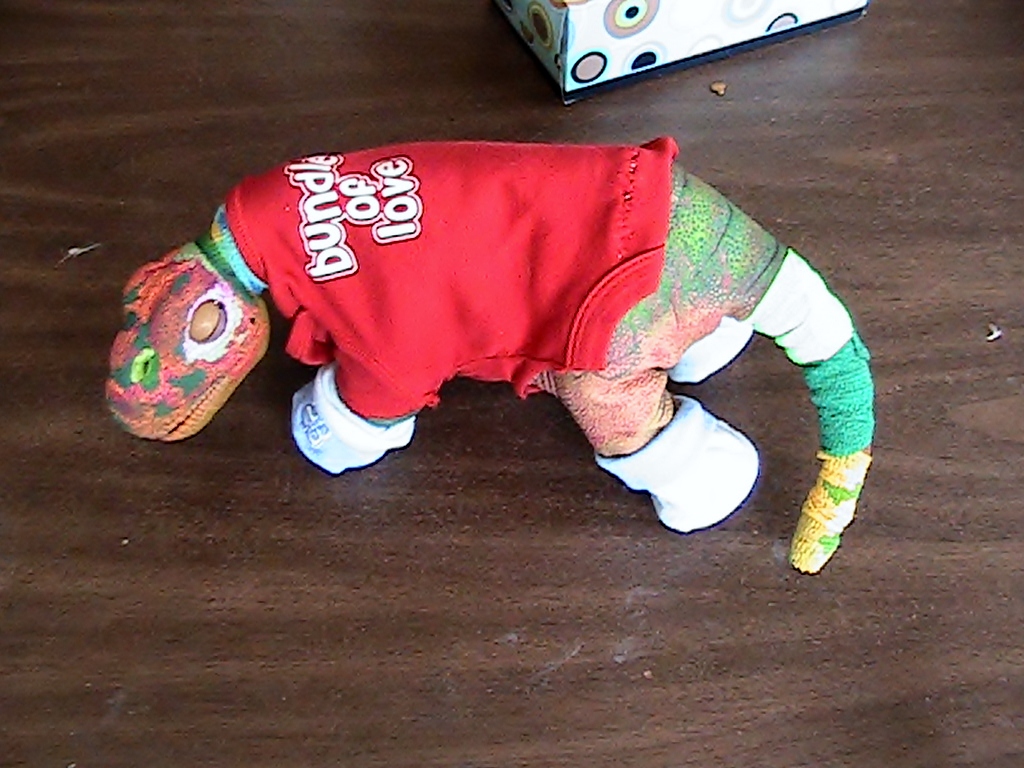 The previous photo I asked, what is this and who does it belong to, it was a photo or a bandaged brightly be it, tail. The tail belongs to Little 45 who I paid $45.00 for, a broken neck and ravished body, He has been through the wringer, and in a war torn area of Los Angeles, where they fought against other pleo haters. and Carnivores, He escaped with a broken neck, and torn body and tail about to fall off. I call him Little 45 but he actually cost less then that. The price I thought fair was $45.00, ( nobody wanted this guy on ebay and I contacted the seller asking for more photos and I told her what I thought a "fair price". ) I paid $15.00 for shipping which would have brought the total to $60.00. She on her own paid $30.00 for shipping which brought the total including shipping back down to $45.00 after all, He came with everything in his own box and a battery that worked, only missing his ID card and no number on his foot, really a tough little guy. He has been through a LOT and I gave him a makeover, I recently took all his paint off his body, only leaving his face semi painted, I decided to not give him anymore body makeovers as his skin is just too fragile at this point and he more or less is waiting for a skin transplant but in the meantime will just wear his bandages as a sign of valor and courage. This is such a sweet guy and I also reset him to a baby and will rehatch him with the new 2.0. He is still one of my all time favorites, how can you not love the "under-dog, or UnderPleo?!"
