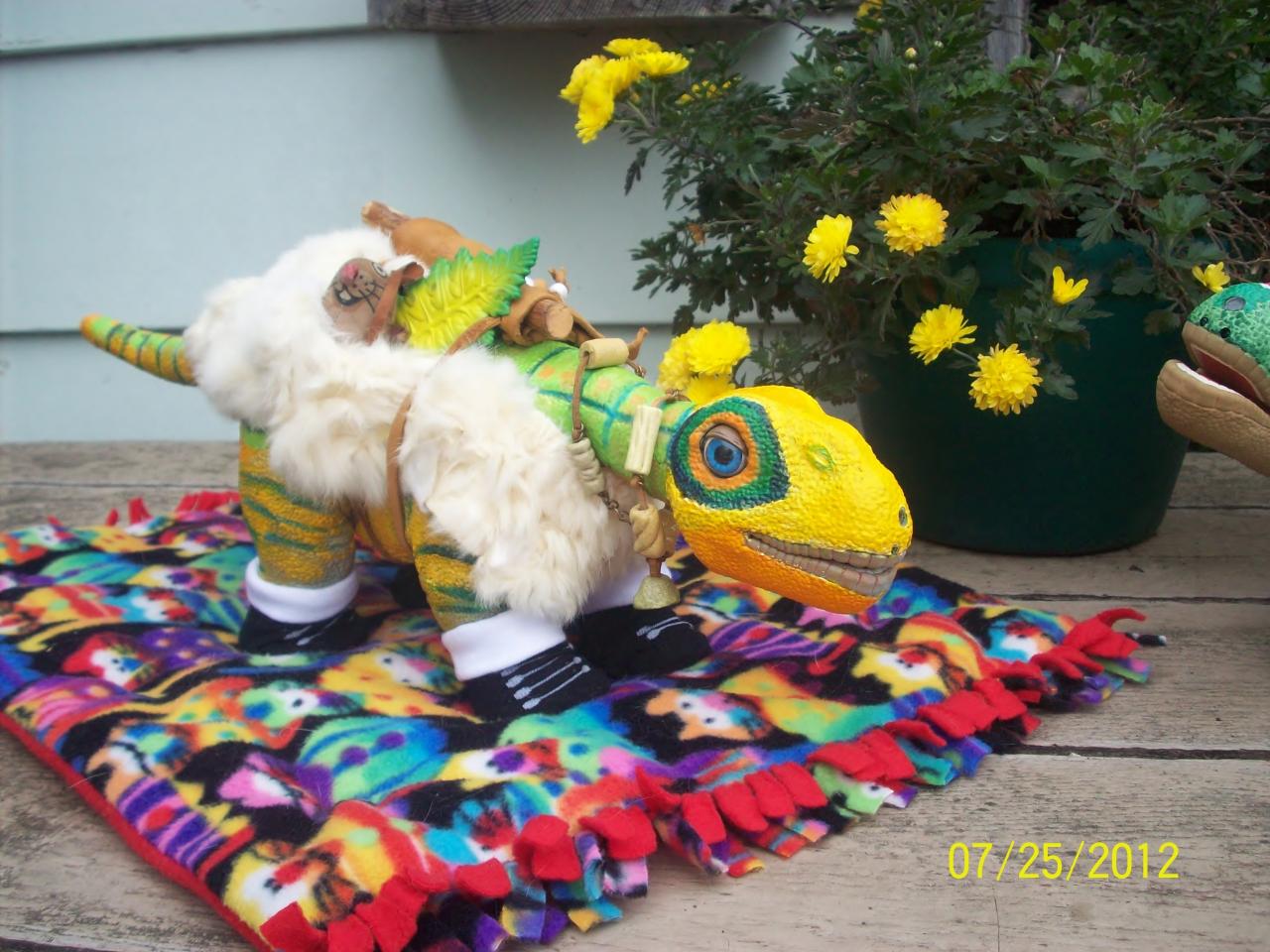 "Sunny" the pleo is completed now, painted that is and is setting off for a weekend camping trip, He has his bags packed, has his leaf, a bedroll, a log for starting a fire, and his buddy, Muffy the mouse riding along to keep him company.