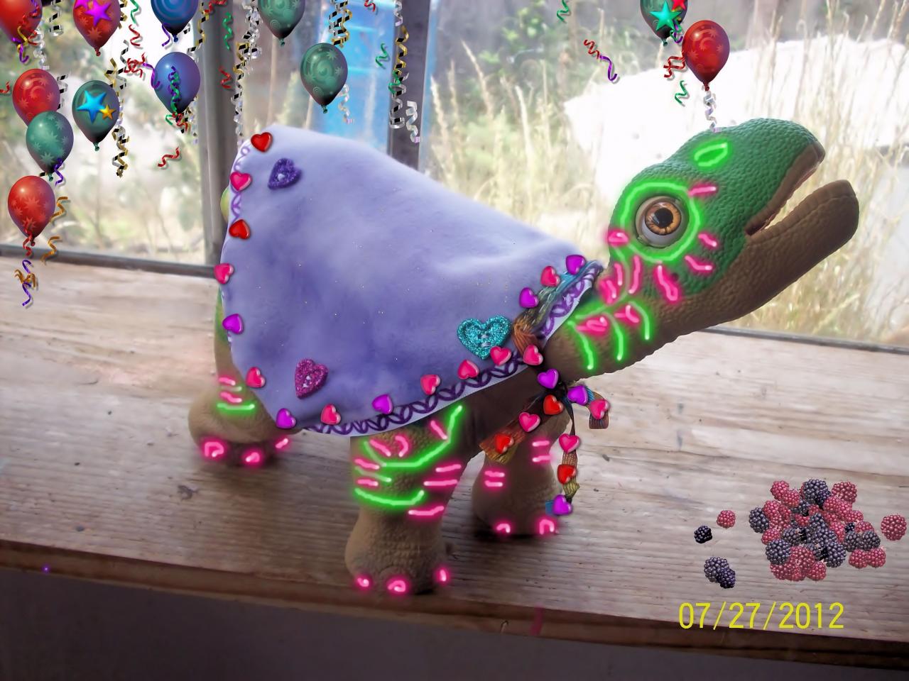 This is what happens when you let loose some baby Pleos and Pleo Rb and let them get into the neon body paint, They also have some fun balloons and someone also picked some fresh berries just intime to party like a Pleo. The cape I made several days ago. Hope you like the "special effects" LOL