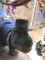 Major Tom is modeling a new tye dye blue fleece cape I am in the process of making, It has a nice skull sequin embellishment on the back and I need to add the trim ribbon which is a surprise but goes with the theme, and any male would like it, and perfect for Halloween. I also have a nice black tophat with black ribbon that has skeletons that are dancing on it as trim,