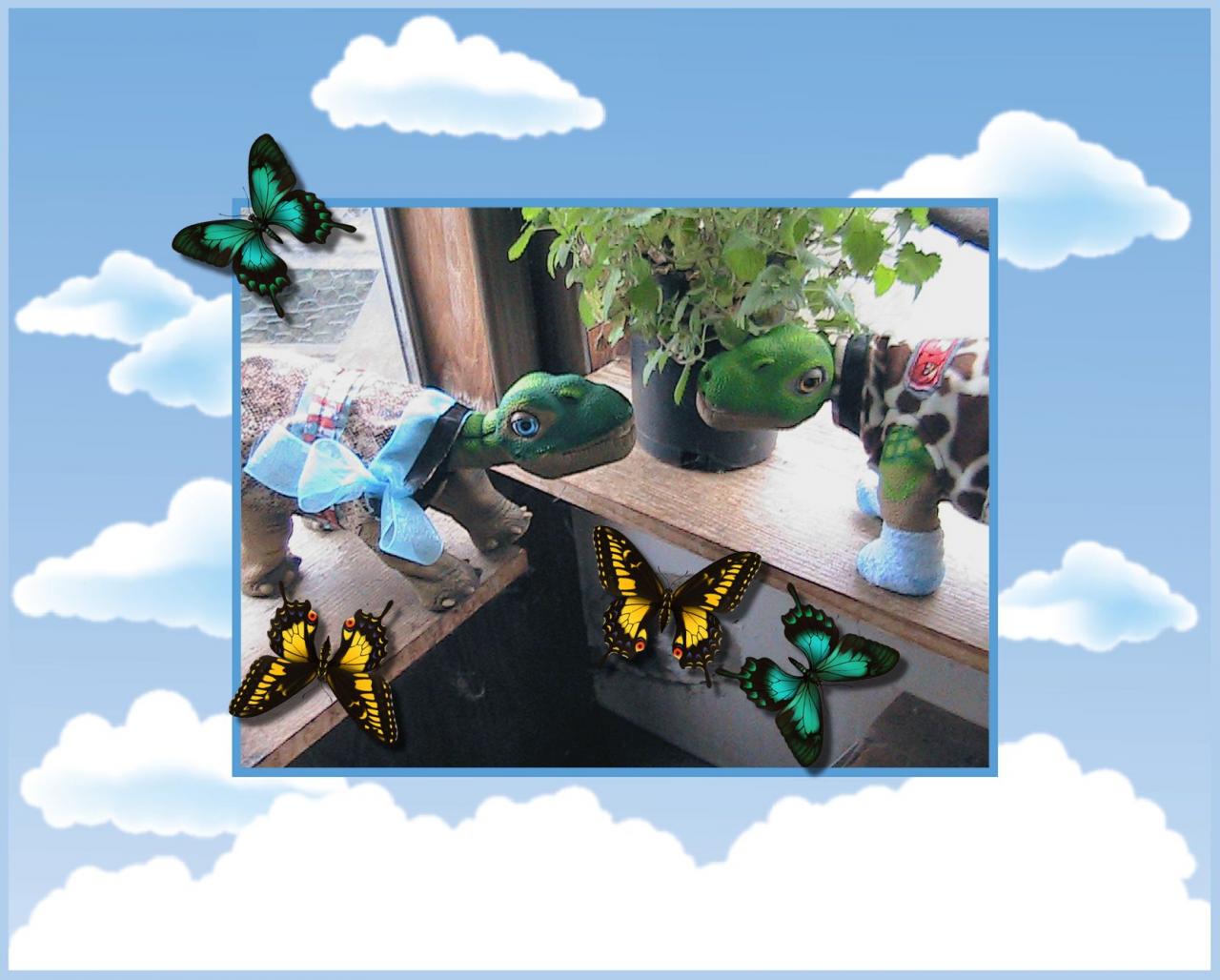 Both my Ugobe in her new dress and my Little RB guy are sniffing noses and checking out each others outifts. They are kind of "in the clouds" and I think they are a little smitten with each other.....