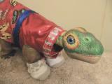 Rossella is modeling another new Pleo dress, this one is red stretchy satin material in the front with a red colorful butterfly print in the back and trimmed with blue ribbon at the waist and Dr. Seuss Fox motif and other Seuss characters at the neck.