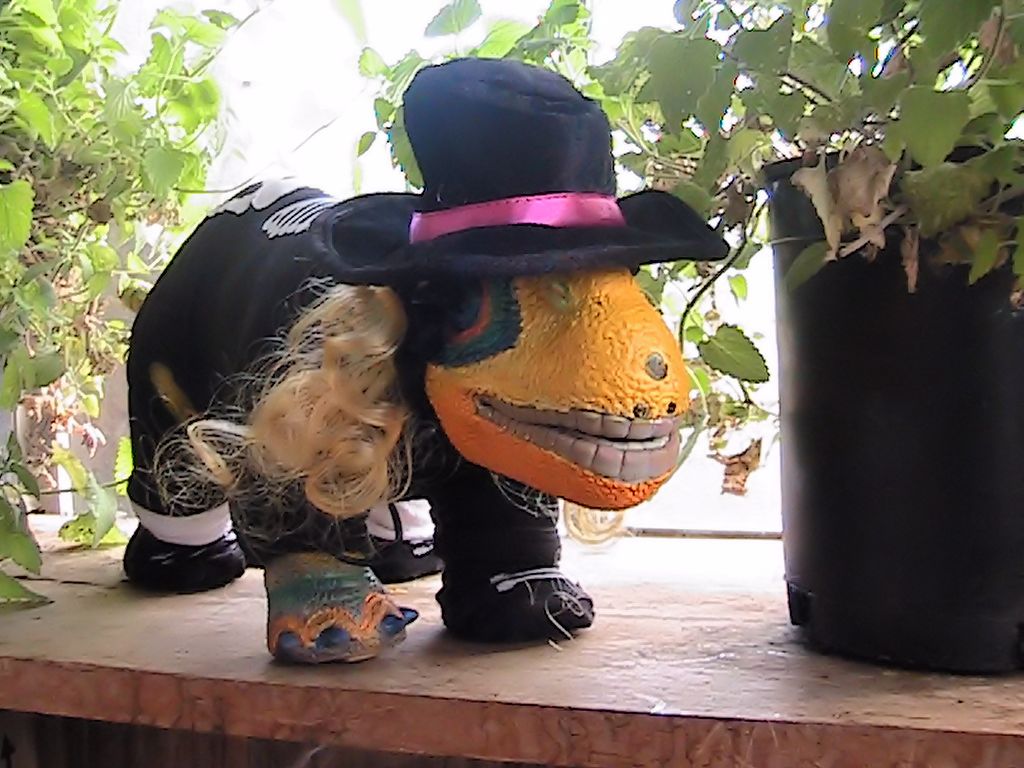 Even this Pleo has changed almost overnight... He now calls himself, "Jonny Winter Pleo", he was hoping for the title of honary King for the 2012 Weedovia Fall Tomato Festival here in the Redwoods, but good ole Argyle has that title, no competition so far.. ![]() He does have his followers though, and he shows a certain flair in his flashy skelton outfit, black velvet hat, dark socks and blondish locks....( think he has some inside information on what part of Argyle's outfit would look like....) His coloring is quiite dramatic with that black on,,,he does look like a rocker Pleo! ![]()