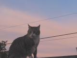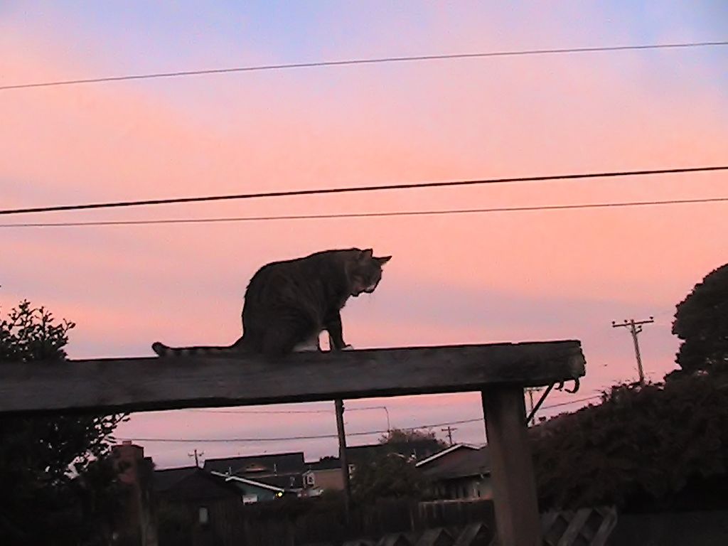 One of my many cats sitting on a huge post with pink clouds in the background as the sun has just come up, storm a brewing..