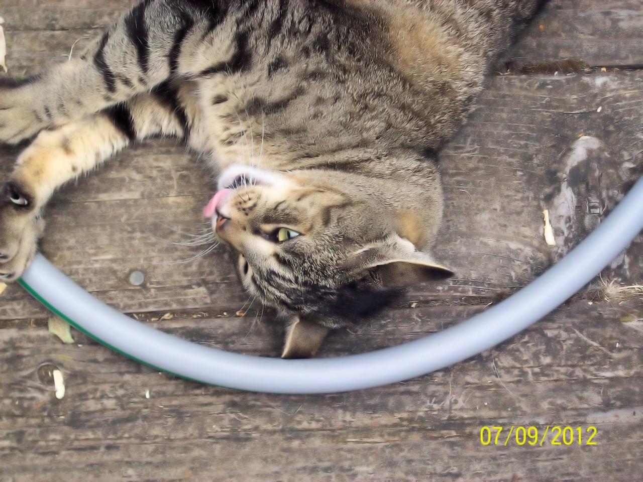 Here is Suzy Q, our youngest cat, and also a rescue from my Father in laws property. We got her as a kitten, Here she is playing out on the deck, she loves to mother everyone and has the nasty habit of washing our hands when we pet her. Her rough tongue will drive you crazy and you have to pull your hand away.