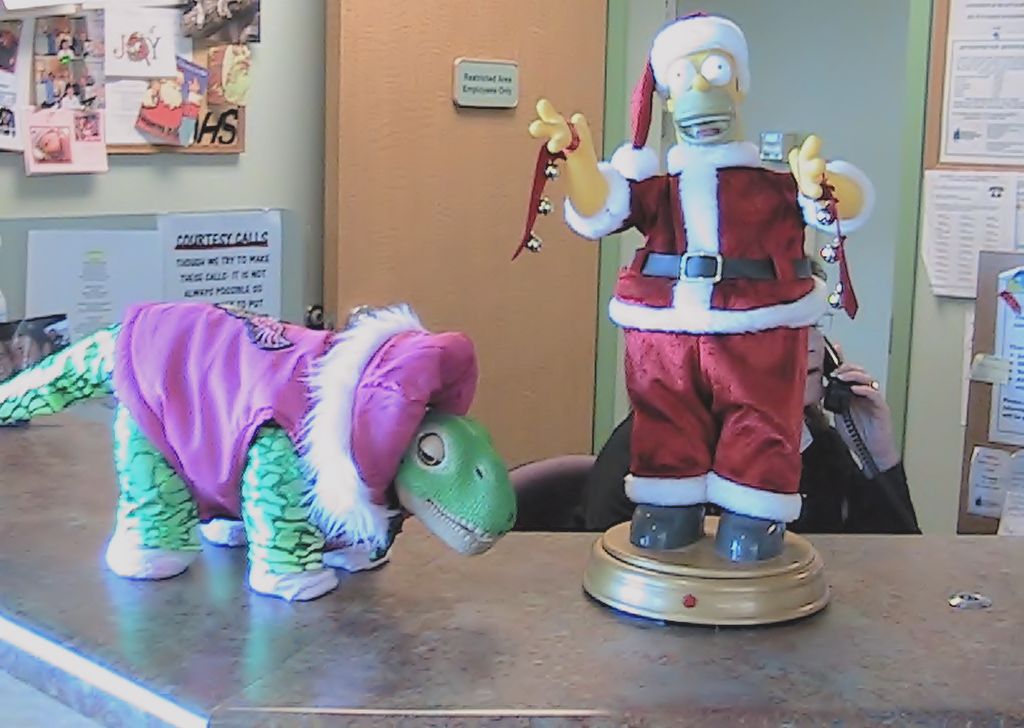 from the video, here is one of the photos, Cammie Sue finding the purrfect Santa, Homer Simpson Santa.