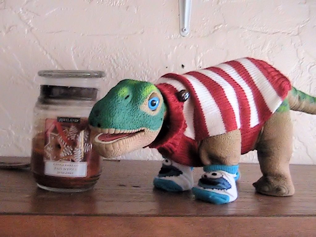This is Pierre, the Pleo on visit from across the great divide. He has been here since last Christmas and seems to love wearing sweaters. He is also quite cute with the little Sesame street socks I think, he has his own style.