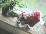 I really like this one of Coral the Pleo doing his balancing act on his tail, He wanted me to make sure I added, I forgot to say, what his holiday hooded sweater says, "HO, HO, HO!"