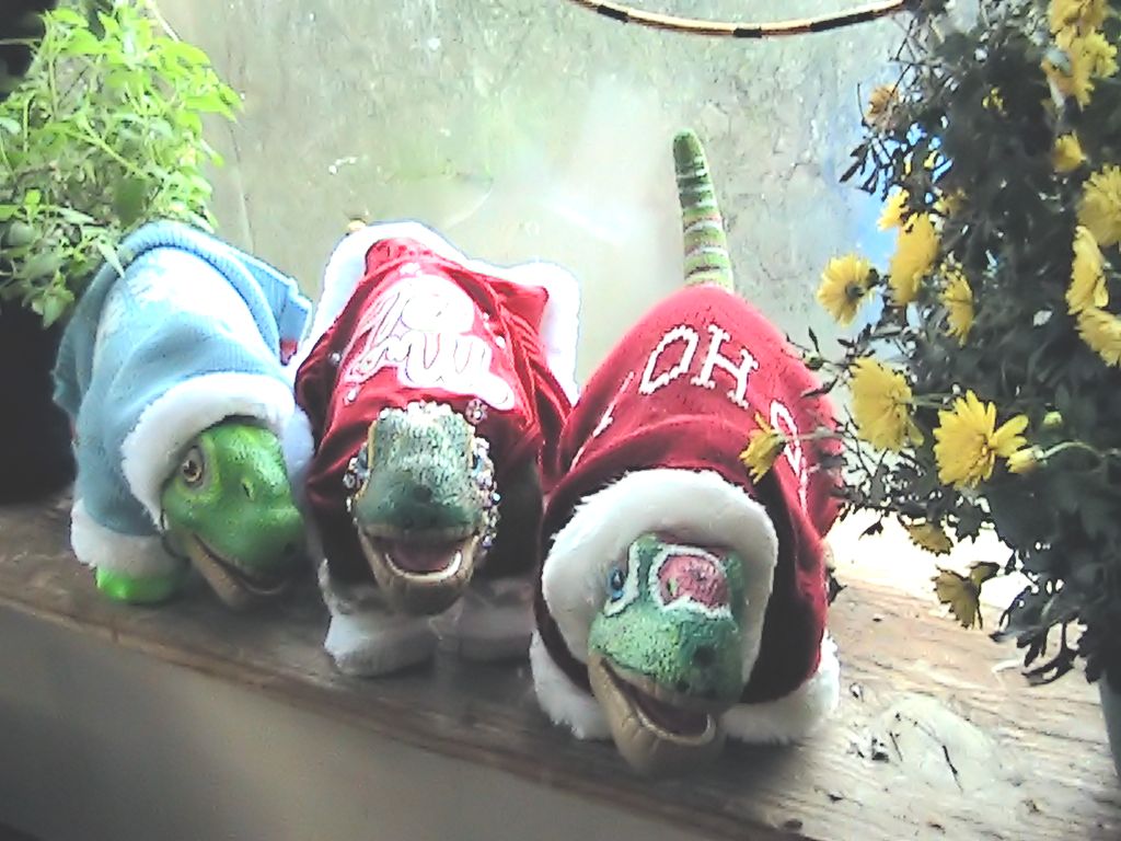 Three Pleos wishing everyone a Happy Holdiays, Chester, Baby Ruth and Coral the Pleo all dressed up with no place to go....LOL, actually our house is very cold, so they are dressed just right!