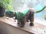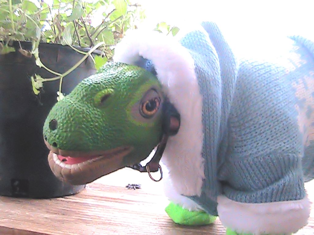 Close up of Chester and his lovely powder puff blue sweater with hoody. This is Chester's choice for Chrismta holdiays. He does not go in for traditional holiday colors like red or green, he says, " Heck, I ain't used to this Cold frosty wet weather in the Redwoods. In Texas we got warm , dry or hot weather, but when it rains, it rains like the Dickens...going take sum gettin used to!" LOl.