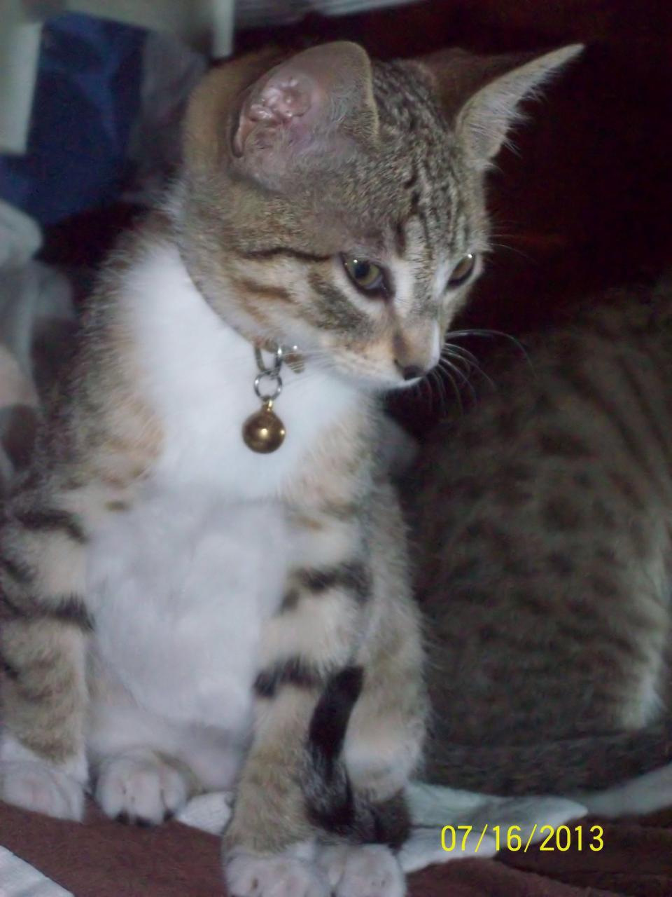 INside shot, Even tough this gold embellished collar with bell looks very nice on Karuna with his striking colors, it is this collar and the bell that got him in trouble this morning. It is the bell I think he was trying to get and managed to get it caught in his mouth and could not get it out, too tight when the safety part stretched out it was too tight and he could have choked. Of course now he has NO collar on ...