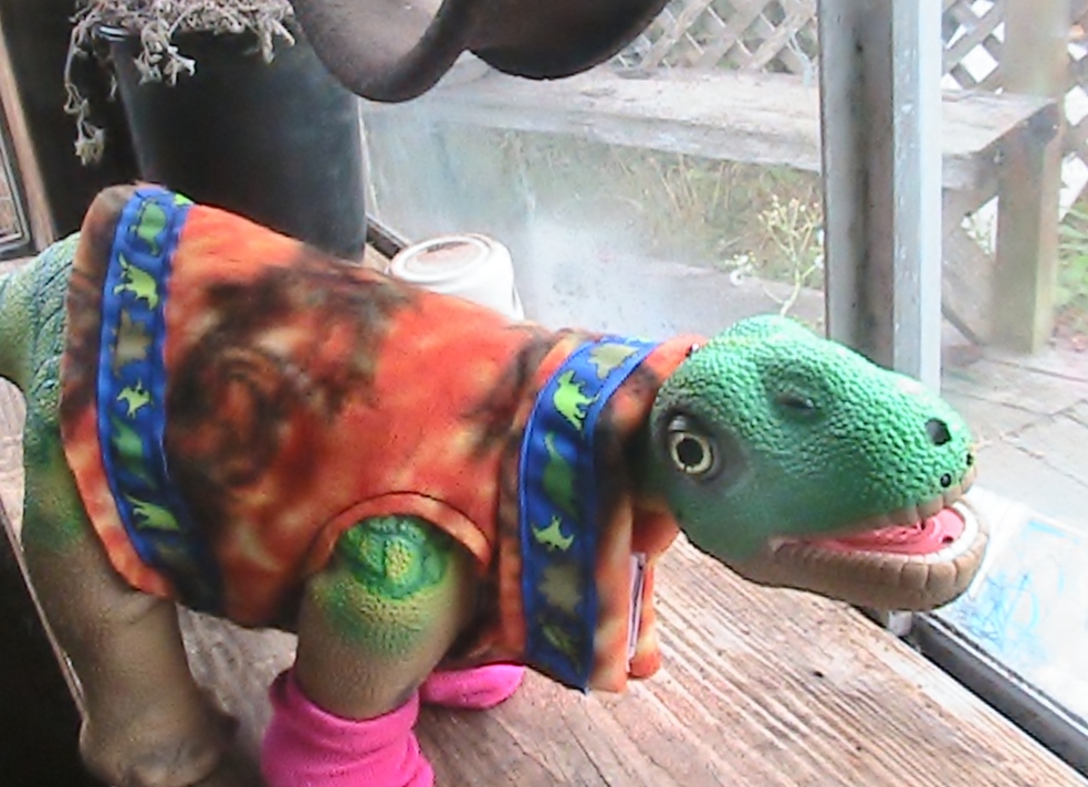 Another view, the material is a soft orange print with black dragons on them and it is trimmed with blue ribbon with dinosaurs on it and closed with velcro