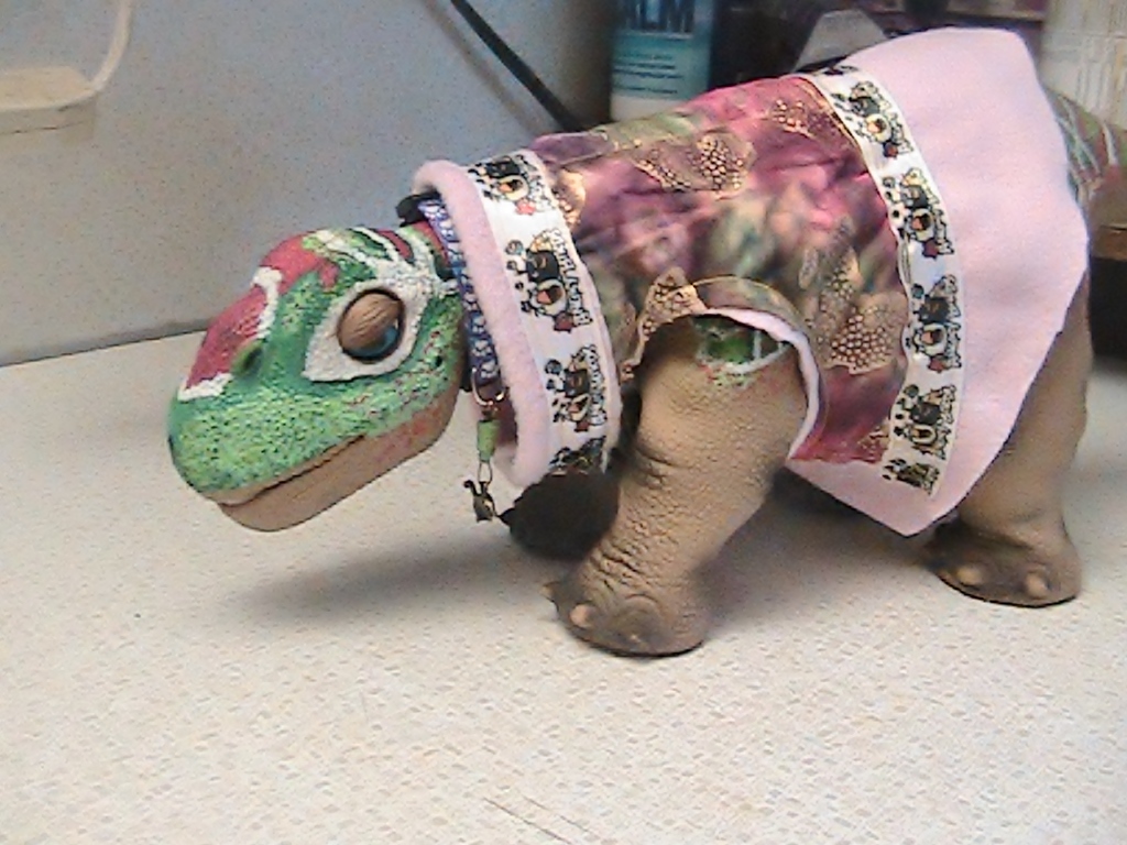 Coral the Pleo models a batik and pink fleece outfit with angry bird trim ribbon
