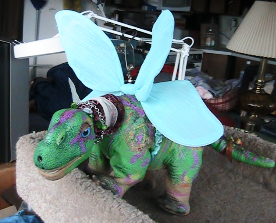 Fantasy Pleo prepares for takeoff, using the Cat Tree, one of the highest spots in the house, He wanted to try the roof first but was warned by the other Pleos, that because of his size, local Ravens may find him a tasty target, so he decided indoors was safer.