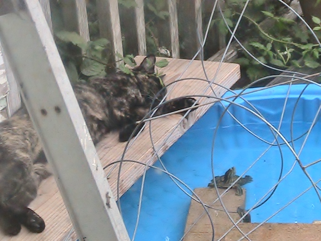 Our two turtles, Crumpet and Snap Pea, watch closely Fuzi, the sleeping cat who is lying on a board over looking their pond, They are used to the cats and the cats in fact often drink from the water, but they are not used to seeing one of these creatures sleeping on "their turf", and are stretching their necks out gingerly to get a closer but safe look.