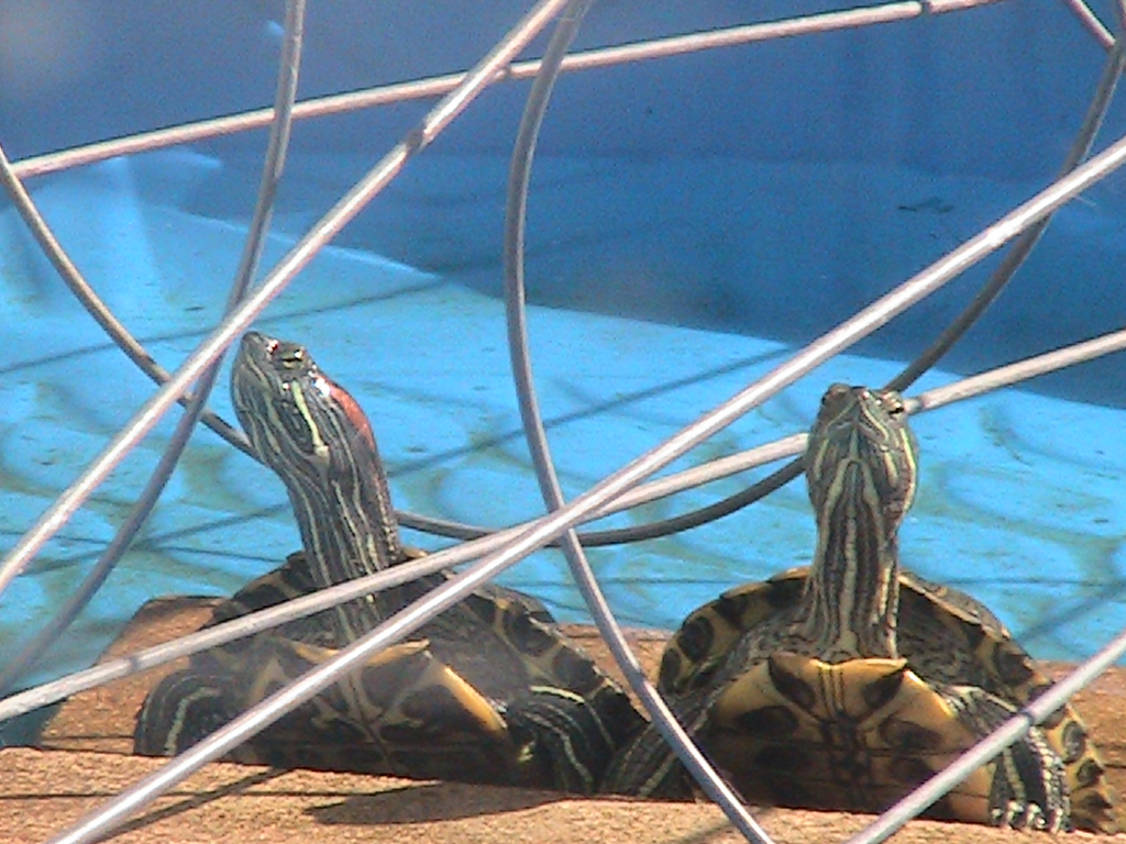 Our two turtles, Snap Pea and Crumpet say the coast is clear and climb out on the cinder blocks together.