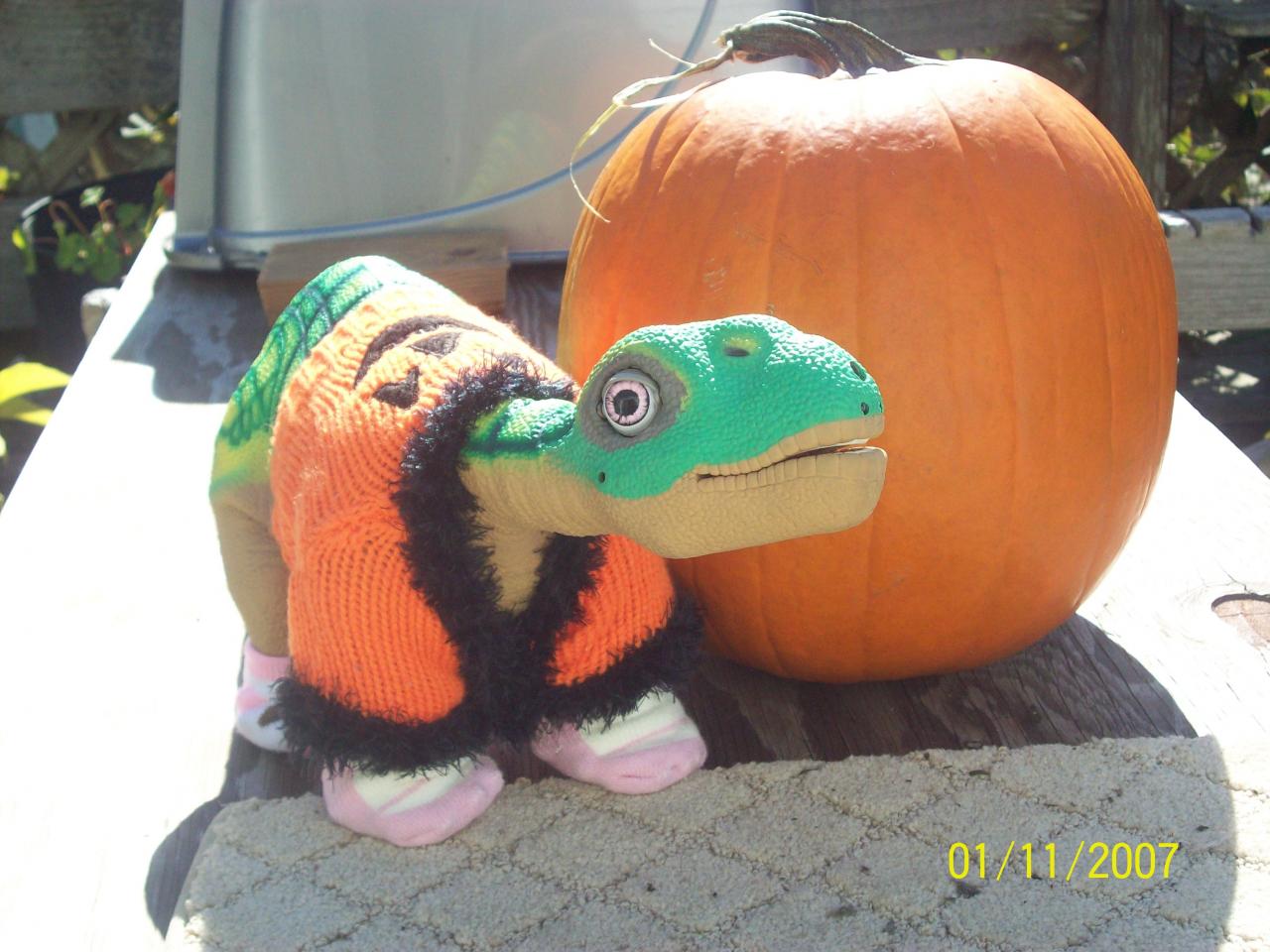 PC poses next to her pumpkin