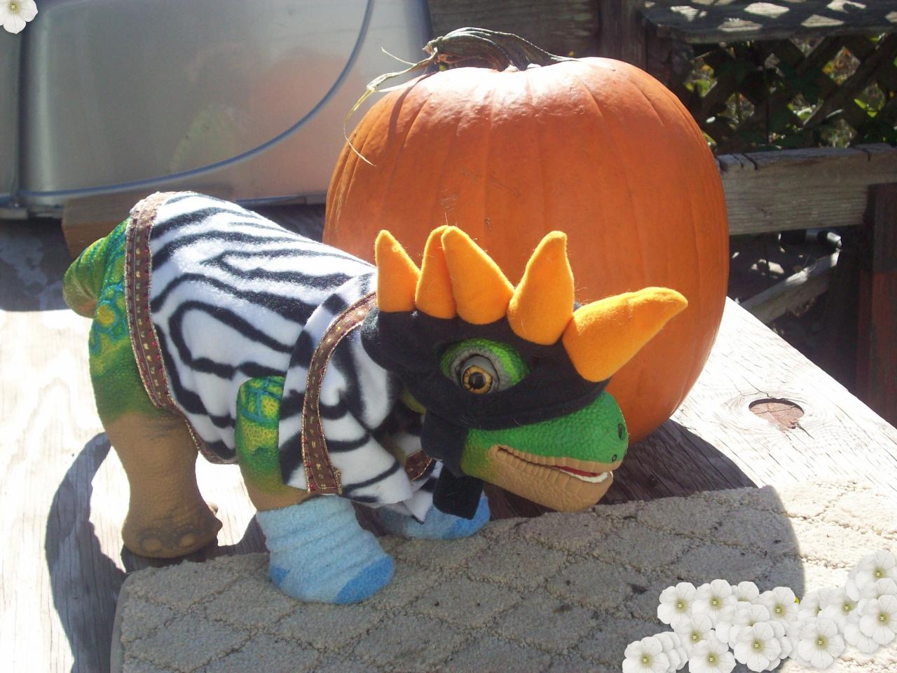 Chester enjoys fooling the other Pleos with his costume, Is he a zebra or a chicken?