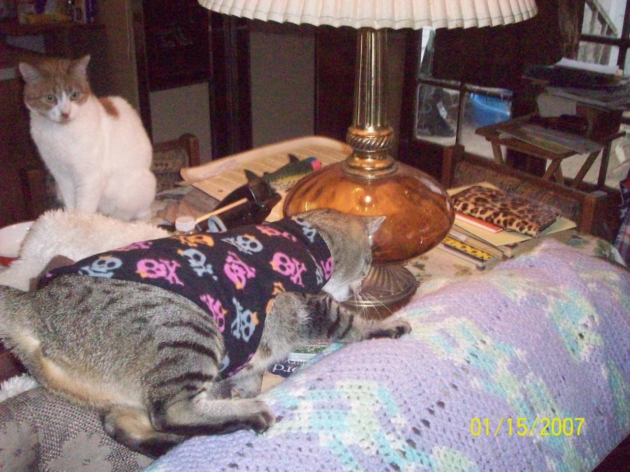 Poor kitty, when she tried walking. she fell over as you can see. Cats have this funny thing about losing their balance or not being able to walk if something is around their middle. This is why the Lightening or what they call, "{thunder Shirts " for dogs or cats esp work so well, they get paralyzed, or kind of like a baby bunting, wrapped tight they feel secure.