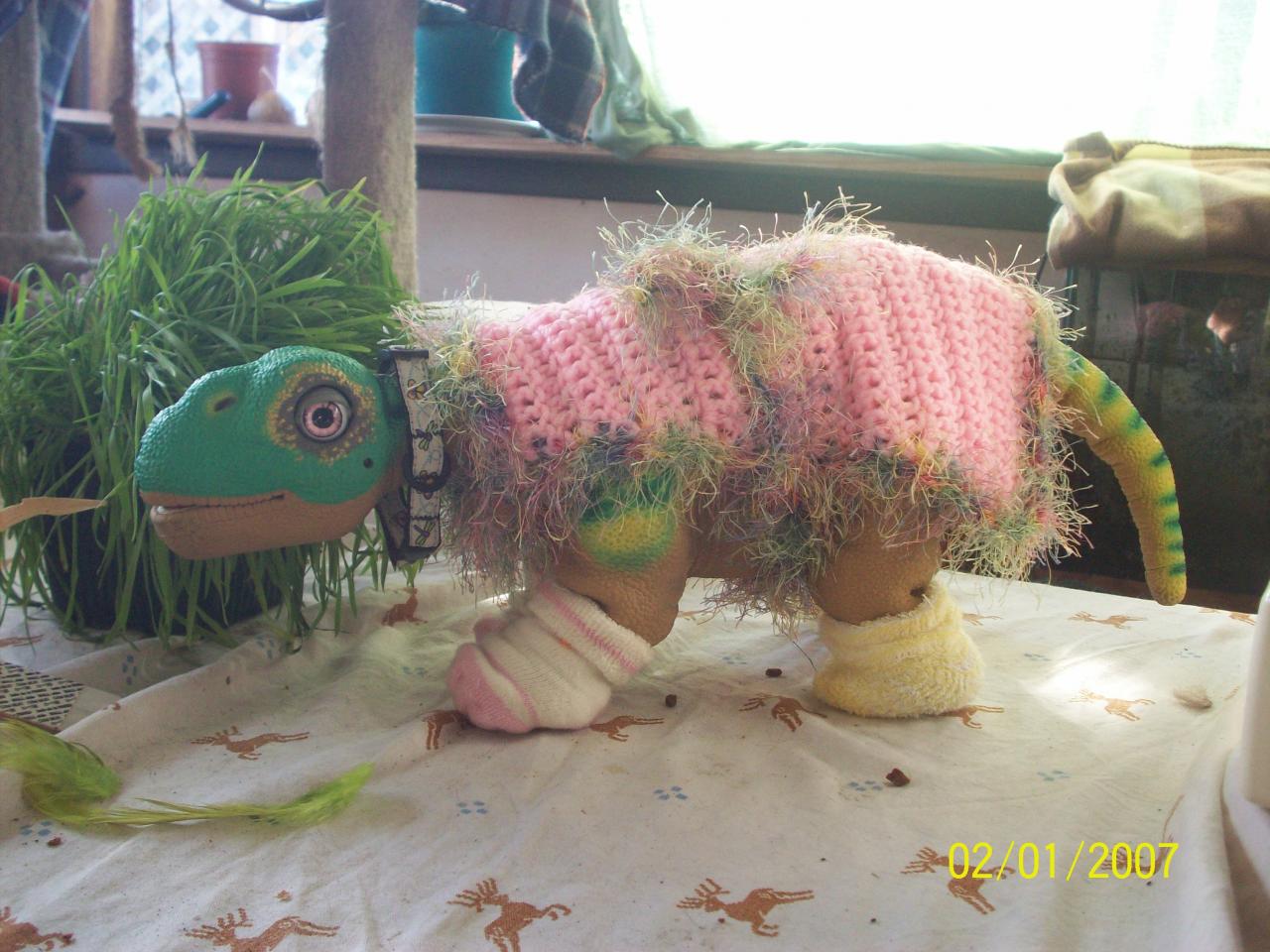 Here are a few more shots of PC in the pink sweater. Yes I made two of these a few months back, one in pink and one in purple or lilac. I will show the other one later, have to take pics. Glad you like it.