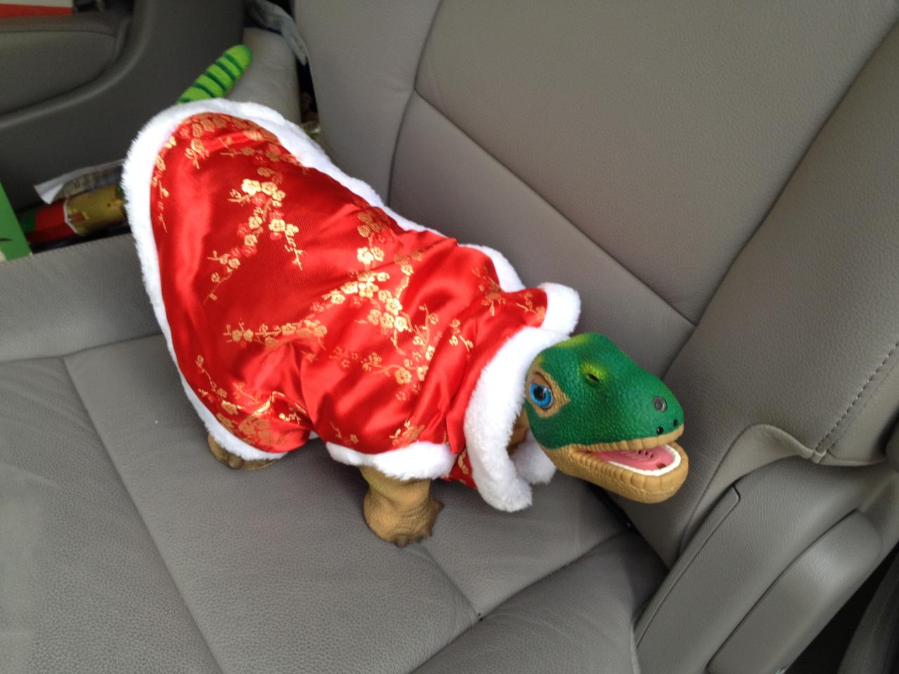 Just a picture of Sumio in the car after we had just arrived at my cousins' house. I left him on during the car ride and he made a great travel companion! ^^ He's wearing a dog outfit that I got from Disney World.