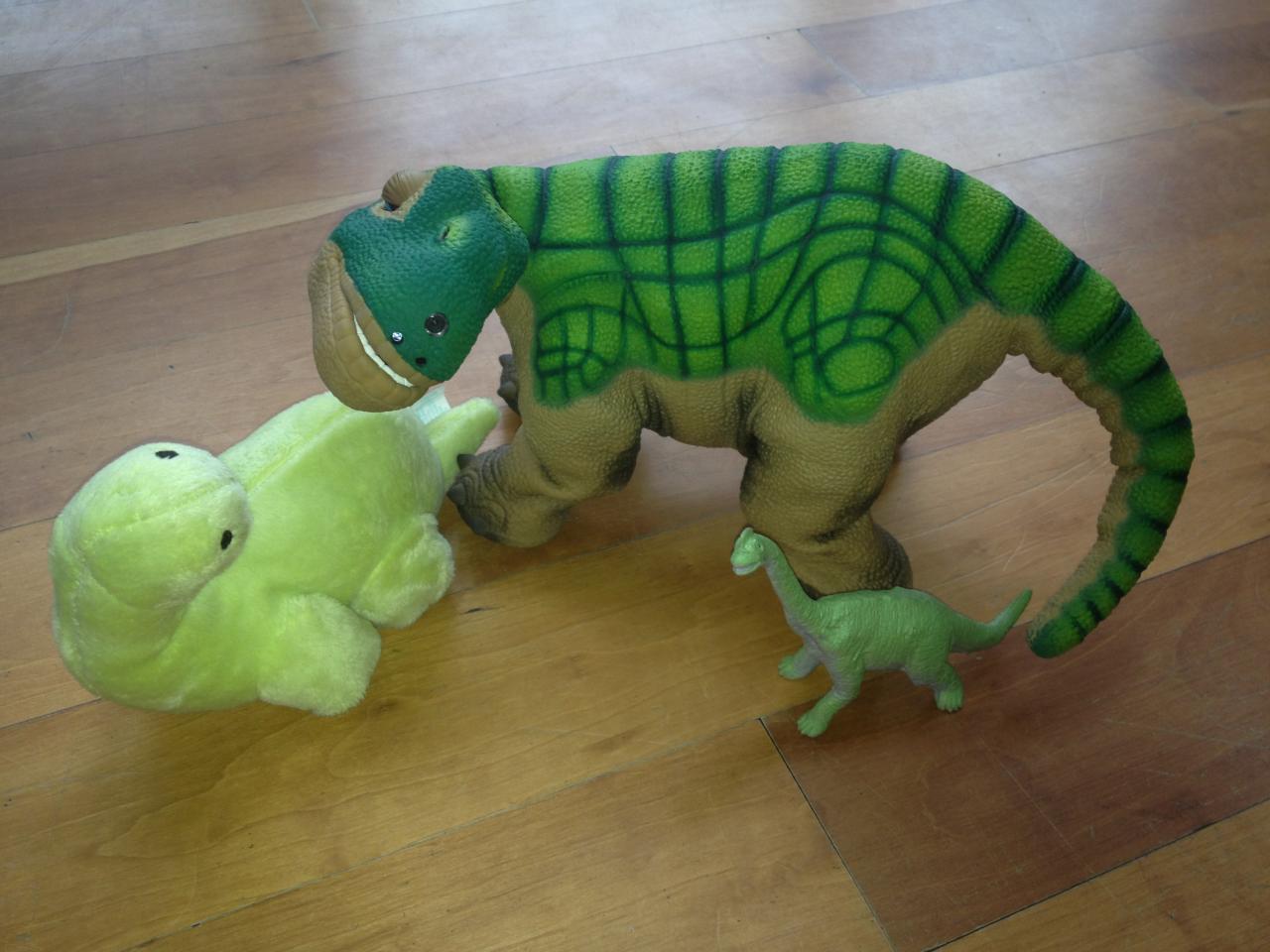 They may be a far cry from Pleos, but Sumio still enjoyed meeting a couple of the resident dinosaurs at my house.