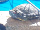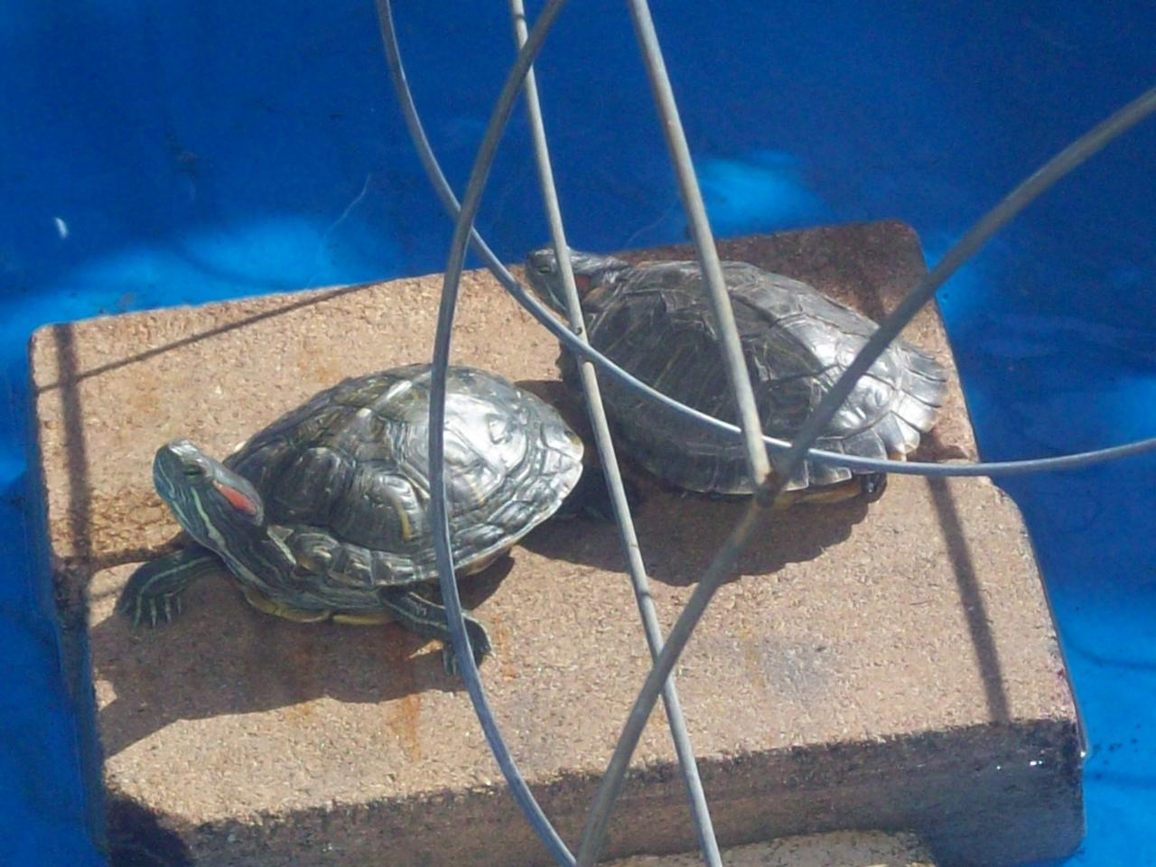 Crumpet is standing guard over a weak and tired happy to be alive Cookie , red eared slider turtle found after being gone for 8 months.
