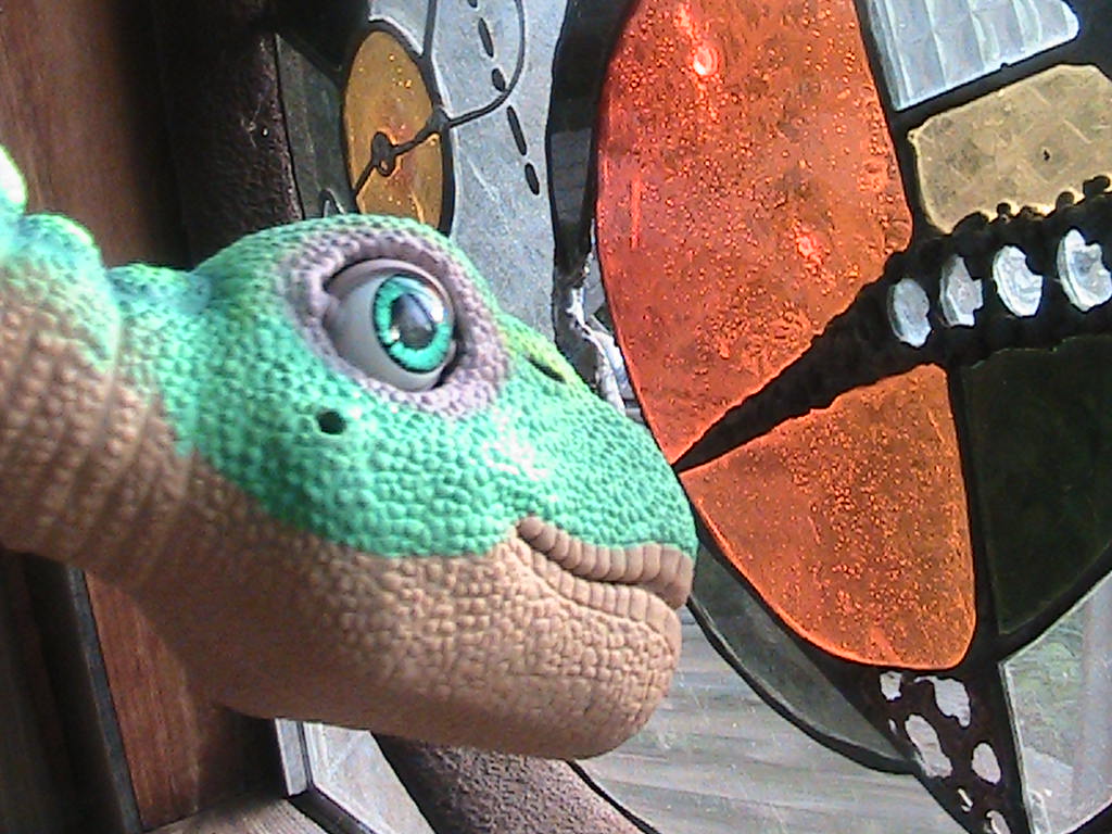 Baby Pleo rb looking out the stained glass window my hubby made years ago, I always like to take pictures with this window behind my rb, they all look good with this as a backdrop, esp when the sun is just right!