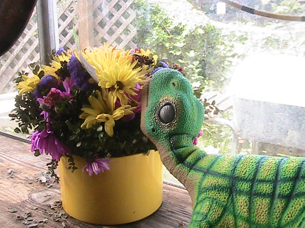 The flowers mean a lot because they honor Karuna and are very colorful in this photo. I think my Pleo , PC would love to eat them if she could.