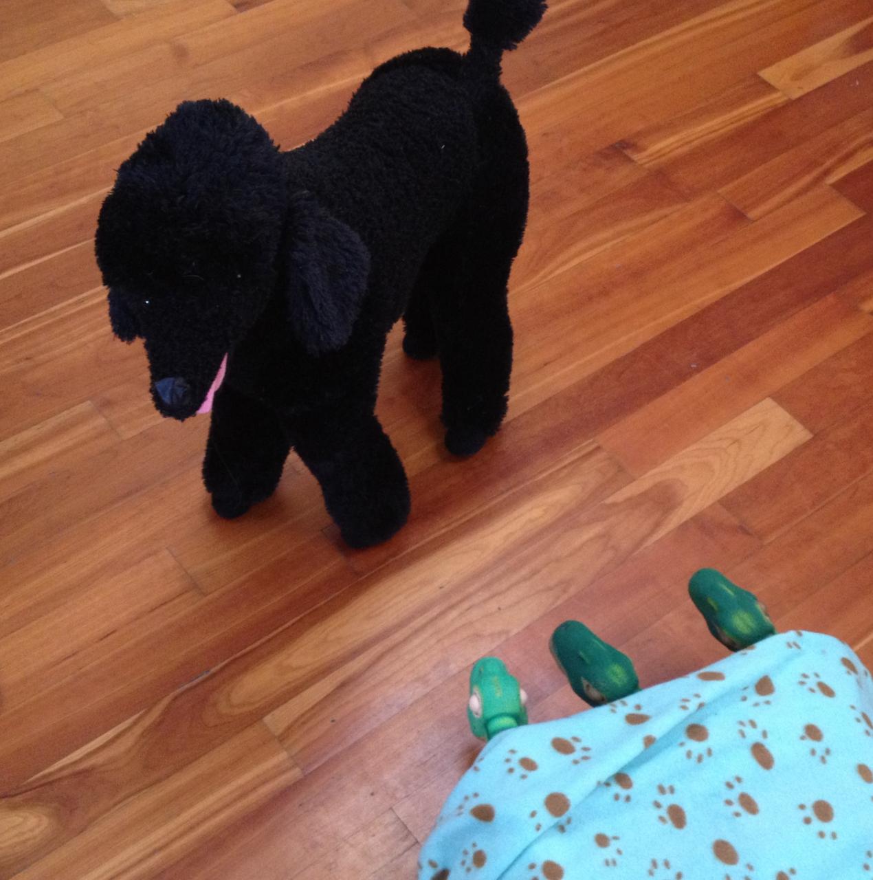 I used a fake plush poodle that I had. I wanted to use one of my real poodles, but they wouldn't stay still for a picture and aren't much bigger than a Pleo, so they don't look very frightening.