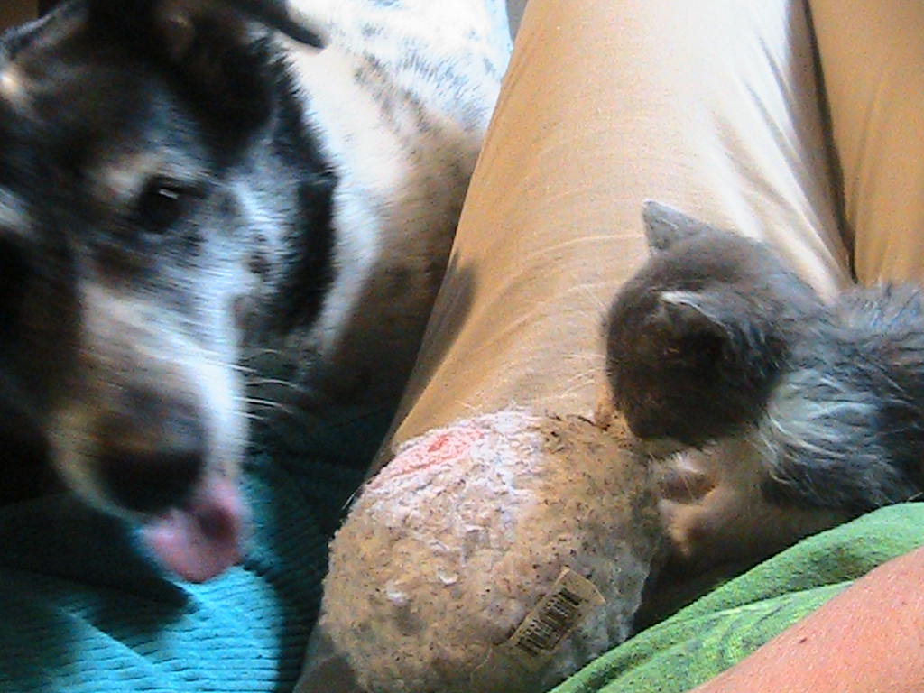 Our newest furry baby, a little boy named Varuna who is only about three to four weeks old in this photo. Our dog, Meh Lie is offering Varuna her ball as a gift. Our dog loves cats!