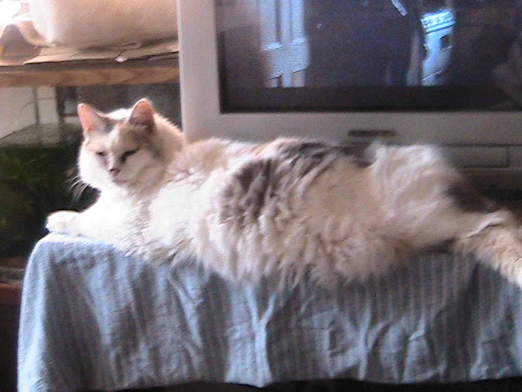 One of two feral kittens rescued , this is April, Alma Von Fluffster, Snowy Owl, Eskimo girl.. LOL, My husband gave her all the nick names except April which is her given name as she was born on April fools day, in 2007. I brought her home during a huge relocation rescue of a colony of 34 feral semi feral cats and kittens that I took care of for two years plus, She came home as a four month old little girl.