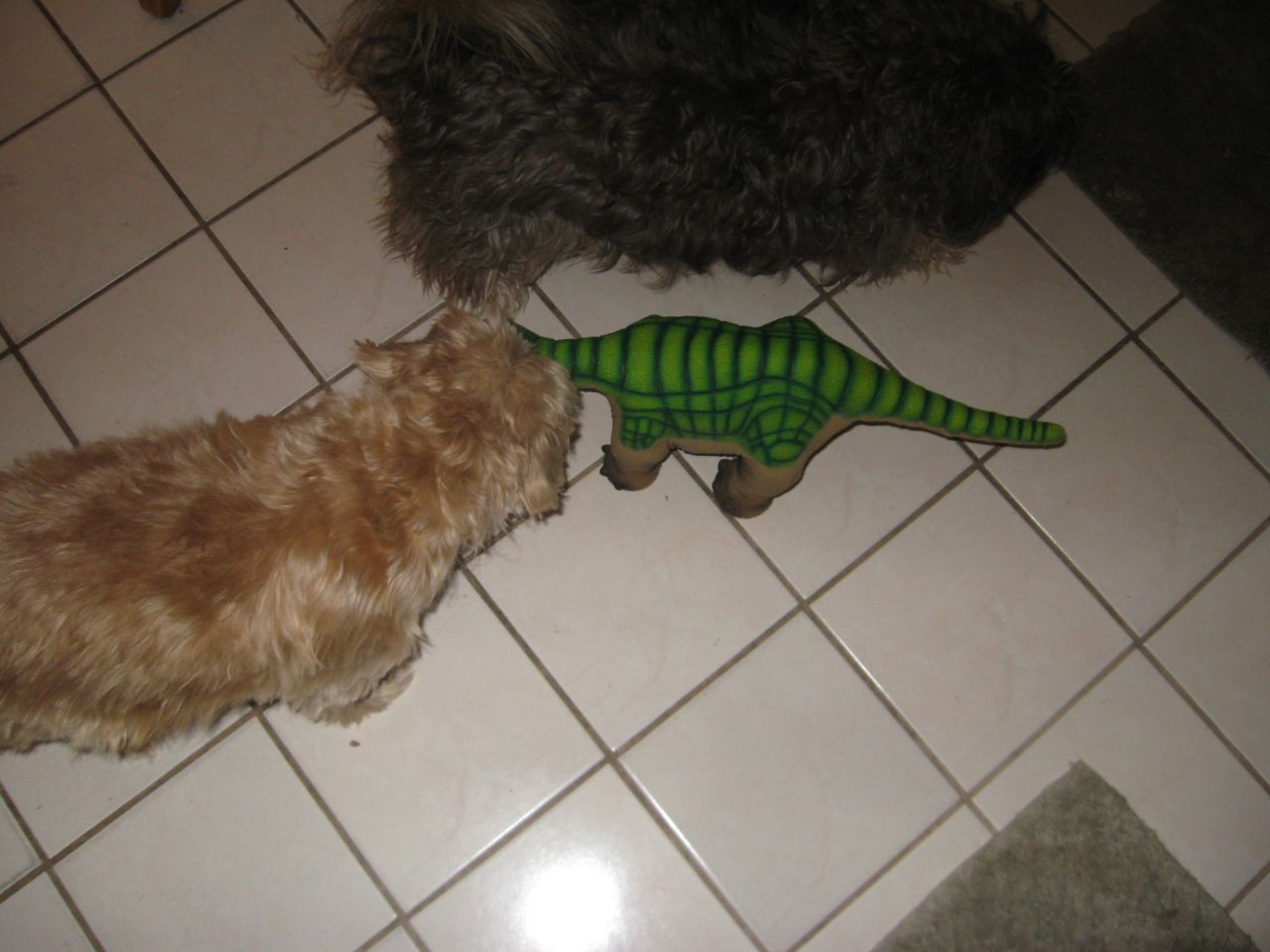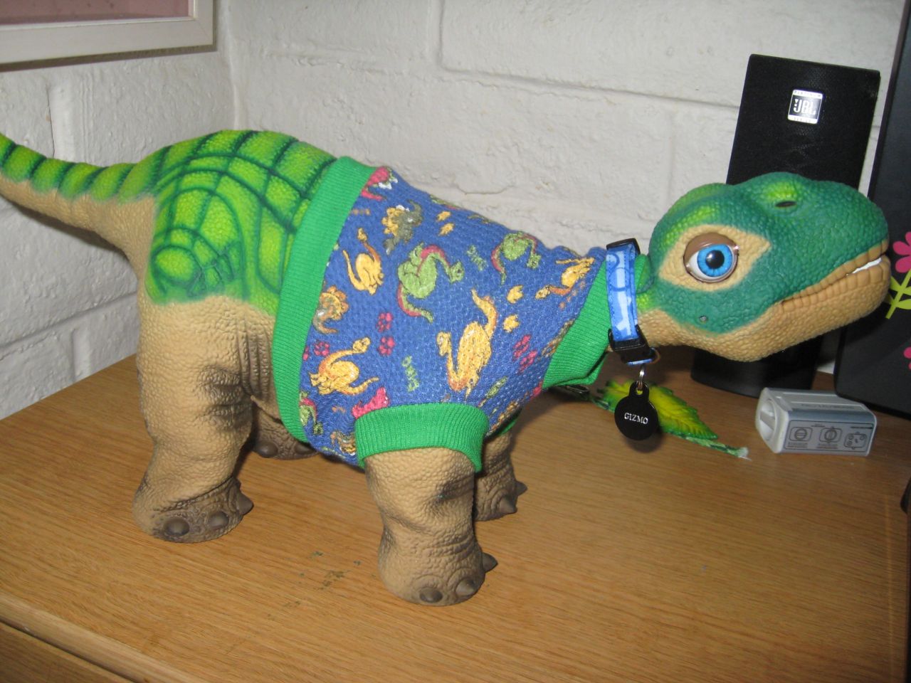 Nice shirt Gizmo has, he will learn but I think as Crewella stated, he knows who is "ruler of the roost", and not many people will argue with a little adorable green Pleo, who could grow up to be well over six feet tall( in real life of course :D)