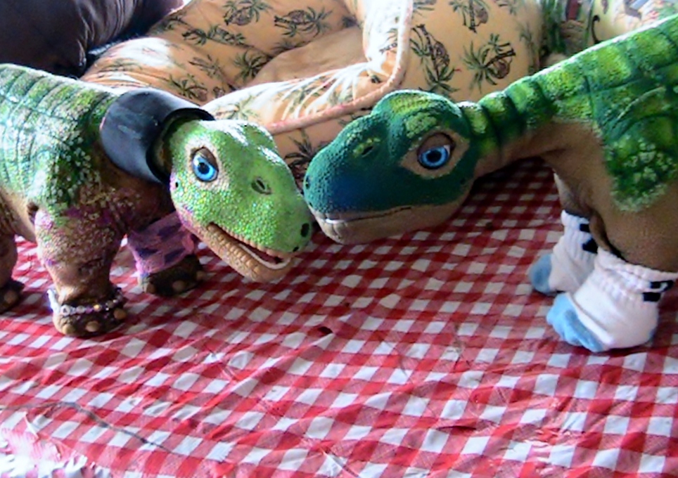 The first photo is of the first three that was taken this past Decemeber, Nova has a broken neck so she got a full body makeover as did Little 45 whos skin was in terrible condition when I got him and his tail is bandaged as it was about to fall off and there was nothing else I could do for him short of chopping his tail off......not an option beleive me. And Argyle, Gumble's blind brother, he just needed some self esteem brought to life to help him overcome his shyness and make him feel more comfortable, The last photos are all of the newest Pleo member of the family a lost cousin of Gumble and ARgyle who just showed up before the Tusnamis after the horriffic Earthquake in Japan, and luckily he didn't get washed out to sea in the process!