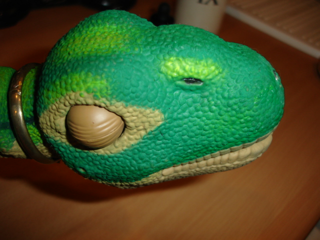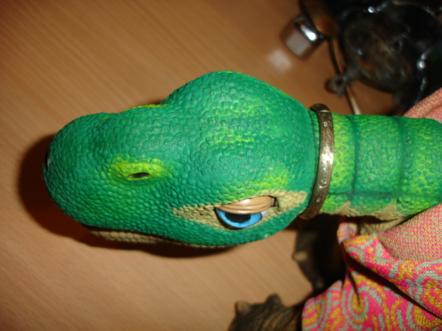 My lizard Pleo , now with the name of Rossella Suriana Adahay, is a completly unique paint specimen, not like any of the others it seems. She was given a good bath, then I used Speedo Inks and let part of her natural green show through, used Yellow Acylic paints mixed with straight Laytex out of a tub to use as the medium, then some Oil paint for her oranges and on top of that, used pigmented powder as a pearlescent effect. There are pictures of the powders I used on this post allso. I did not have real good results with straight Acrylic and the inks do not end up being permanent. Oh and to top it all off, when she was done and I was satsisfied, I put a protective spray adhesive coat on her to protect the paint. She was painted in June, so that is now going on 6 months, so not too bad I would say. ;D