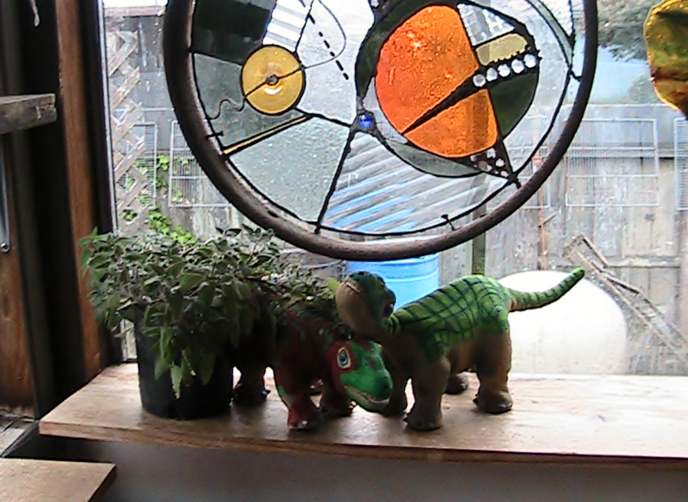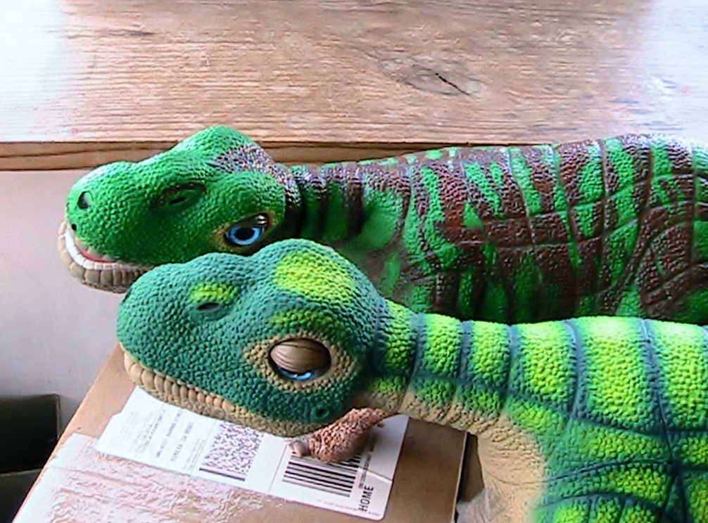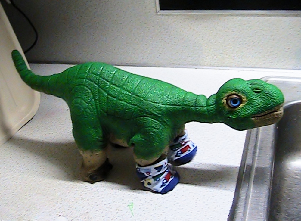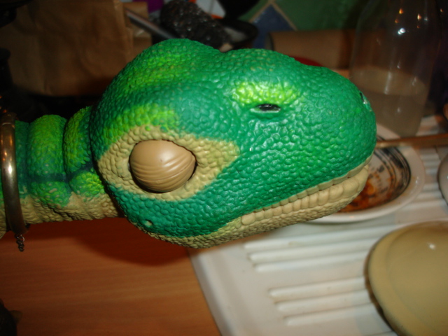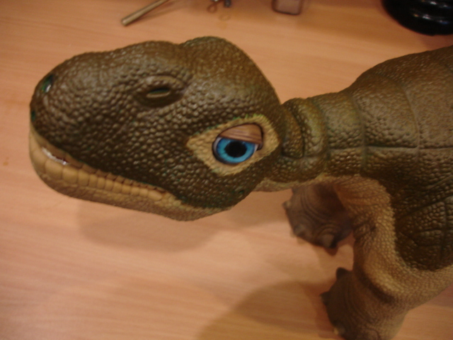 oh well, what can I say. seems as if while I as regenerating some sleep for my human body, "The Mad Pleo Painter of the REdwoods", had a go with one of my innocent Pleos sleeping innocently on the shelf with it's companions. I must have interrupted their dastardy deed during the night while looking for a drink, and they didn't have the courage to finish their task, as the Pleo has some new color, but only on one side of the body, and the tail was stopped midway! :o I guess I scared them off, so I will have to lie in wait tonight to see if they come back to finish what they started............................