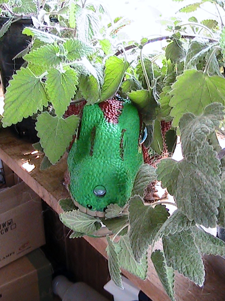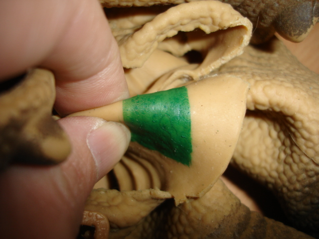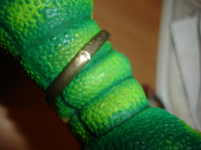 Right, I took some more pics of the dried green layer of paint on Iggy's head: