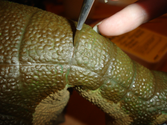 i dont know when i will paint my pleo munchkin, as i need to sort out her awful holes first. in all truthfullness, i havent played with her that much, but she looks like her throat has been cut, and got a huge hole on her tail, just where the skin has deteriorated, so i need to repair her first, but unsure what superglue to use :(