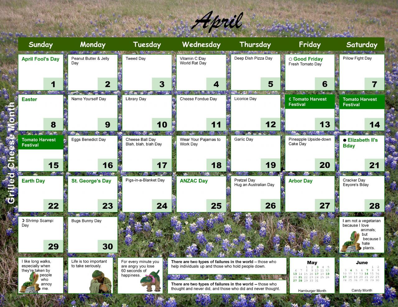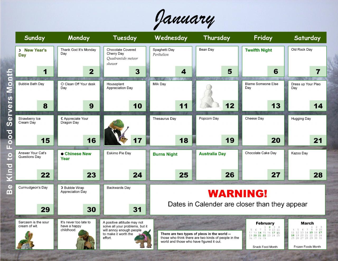 Anyway . . . here's a peek at the rest of the month for those who don't have a calendar. I see Dress up your Pleo Day is this weekend . . . and RWM better get her act together and ready for the 22nd . . . ;) Last year we had a competition for Curmudgeon's Day. There's still time to think about doing something for that again this year . . .