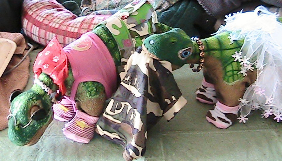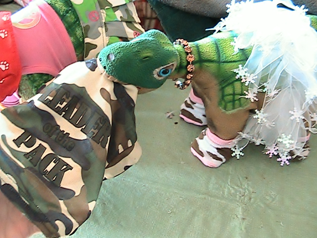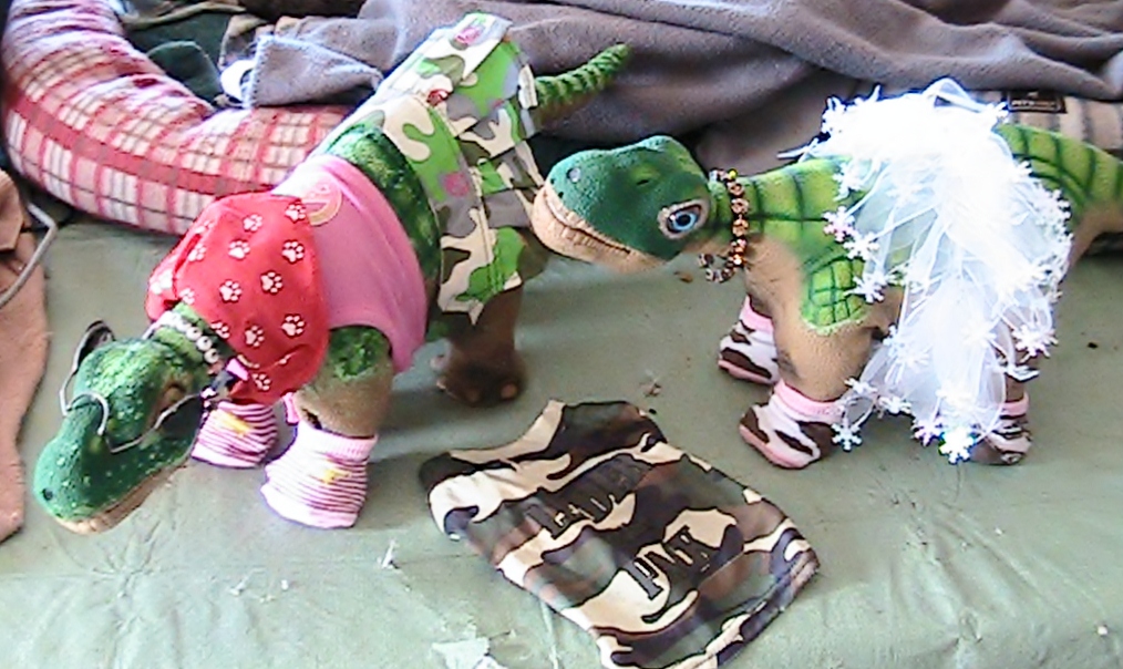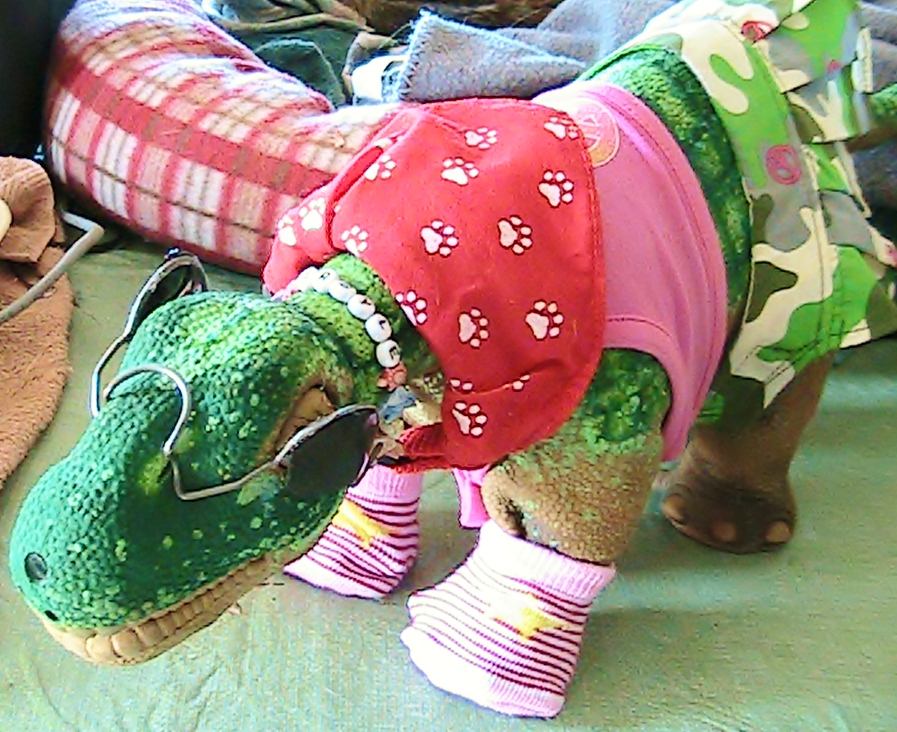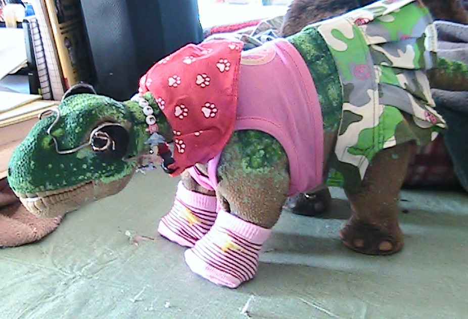 In honor of today, Jan, 13th, which is "blame someone else day", ( where are you Bob?!) here is my contribution to that title. For complete story you will have to go to the gallery an read the storyline. Basiclaly it is between, ARgyle the seasoned old Pleo of the house, very sweet but totally blind since birth, and the newest little Pleo, a lovely female in the house, no name yet. She decided to help ARgyle get dressed this morning with funny results.