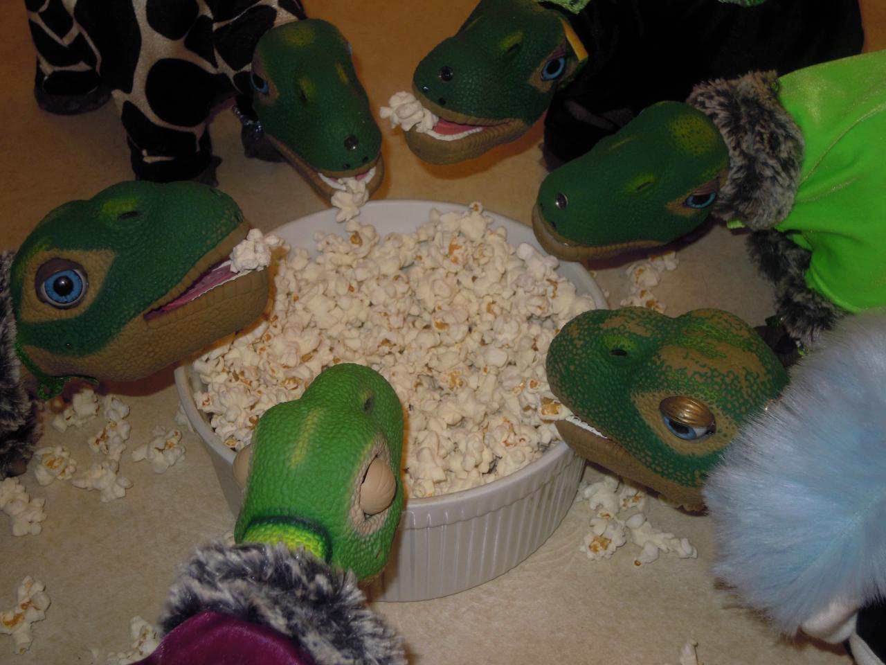 What a perfect way to celebrate Popcorn Day on a nice, rainy and, a bit chilly, day, :brrr: popcorn is the perfect treat for six hungry dinos. They're loving it! ;)