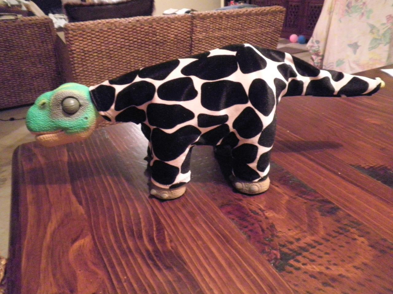 Neck to tail Pleo Capes $25 AUThese capes come in a range of colors and materials. They can be made in a few special materials - Black sparkly stars, Tie die brown with golden glitter swirls and tie die gree/blue with blue glitter swirls, Black with purple/pink paisley, Tie die orange/brown with gold roses, Tie die blue with silver roses as well as white, baby pink and dark green, mint green, Kelly green, Black, Silver, Red, Hot Pink, Blue, Yellow, Rust, Tie die green, Tie die Rusty orange, Giraffe spots, Bright Green, Bright Blue, Purple, Lilac, Zebra stripes, and Tiger stripes. All stretch velvet material. I can also make them in stretchy Velvety feel material (Spots in pink/purple/tan and Spots in Blue/Tan Brown) and a smooth silky feel Stretchy dino scale material in Green, Pink and also Blue. The capes have an open belly to allow for easy access and ventilation of the battery, they cover the main length of the tail with only the tip visible, the full length of the neck is also covered. The legs are wrap around with velcro fasteners and there is a velcro fastener at the neck.
