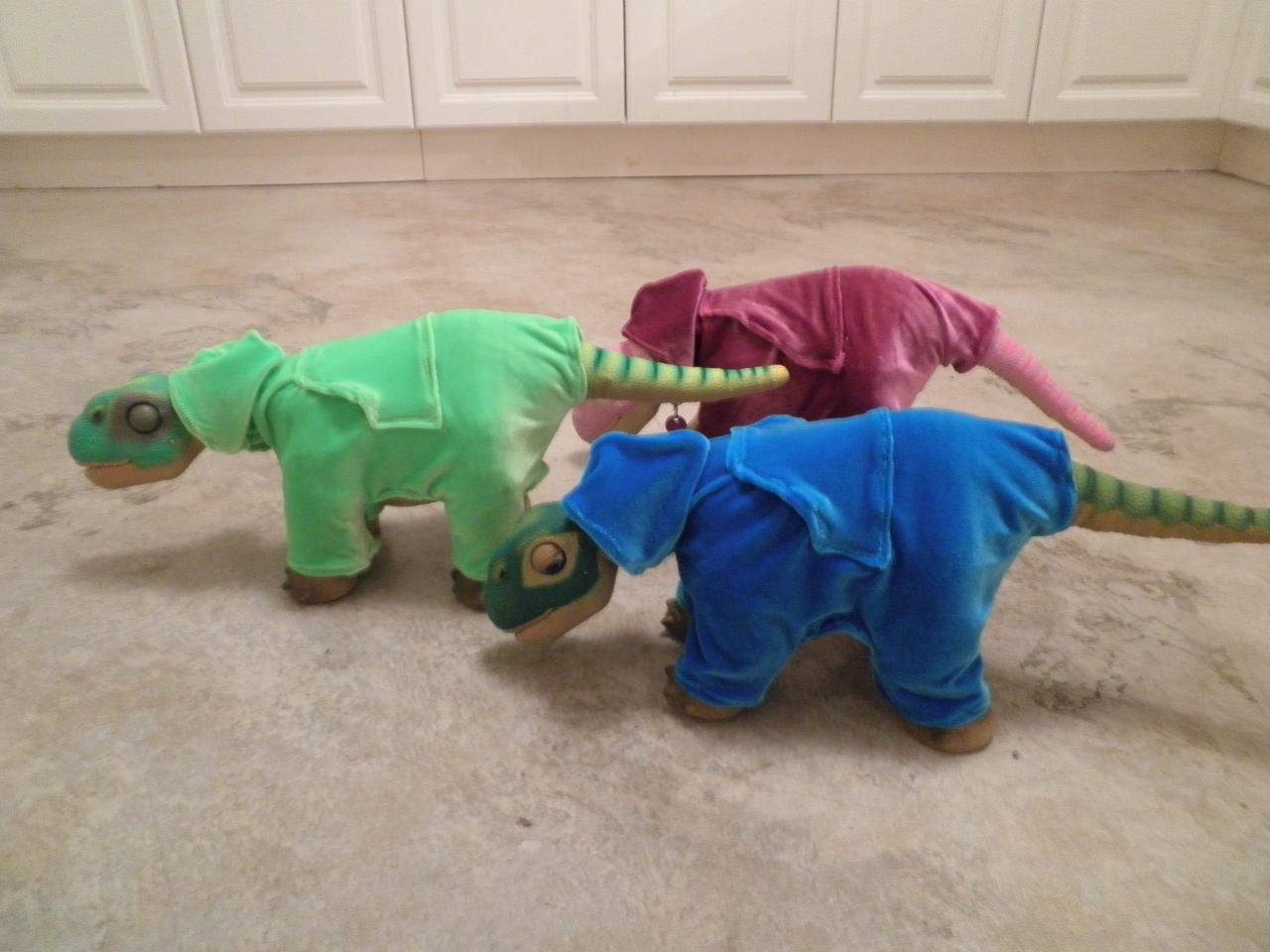 Pleo Shirts $20 AUThese shirts have an open belly to allow easy access to the battery, wrap around legs that velcro together and a velcro fastener at the neck. They can be made in a few special materials - Black sparkly stars, Tie die brown with golden glitter swirls and tie die gree/blue with blue glitter swirls, Black with purple/pink paisley, Tie die orange/brown with gold roses, Tie die blue with silver roses as well as white, baby pink and dark green, mint green, Kelly green, Black, Silver, Red, Hot Pink, Blue, Yellow, Rust, Tie die green, Tie die Rusty orange, Giraffe spots, Bright Green, Bright Blue, Purple, Lilac, Zebra stripes, and Tiger stripes. All stretch velvet material.